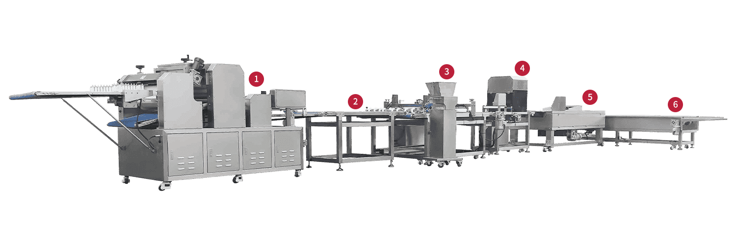 A linha de produção é composta por uma máquina de formação de pão de pastelaria ST-868-600, máquina de desvio de quatro canais, máquina de rolamento de farinha de quatro canais, máquina de concentração de quatro canais, Máquina de corte de pão no servo duplo CT-qt450 (Máquina de corte de pão no vapor e CT-WP500 (Modelo 500). $.